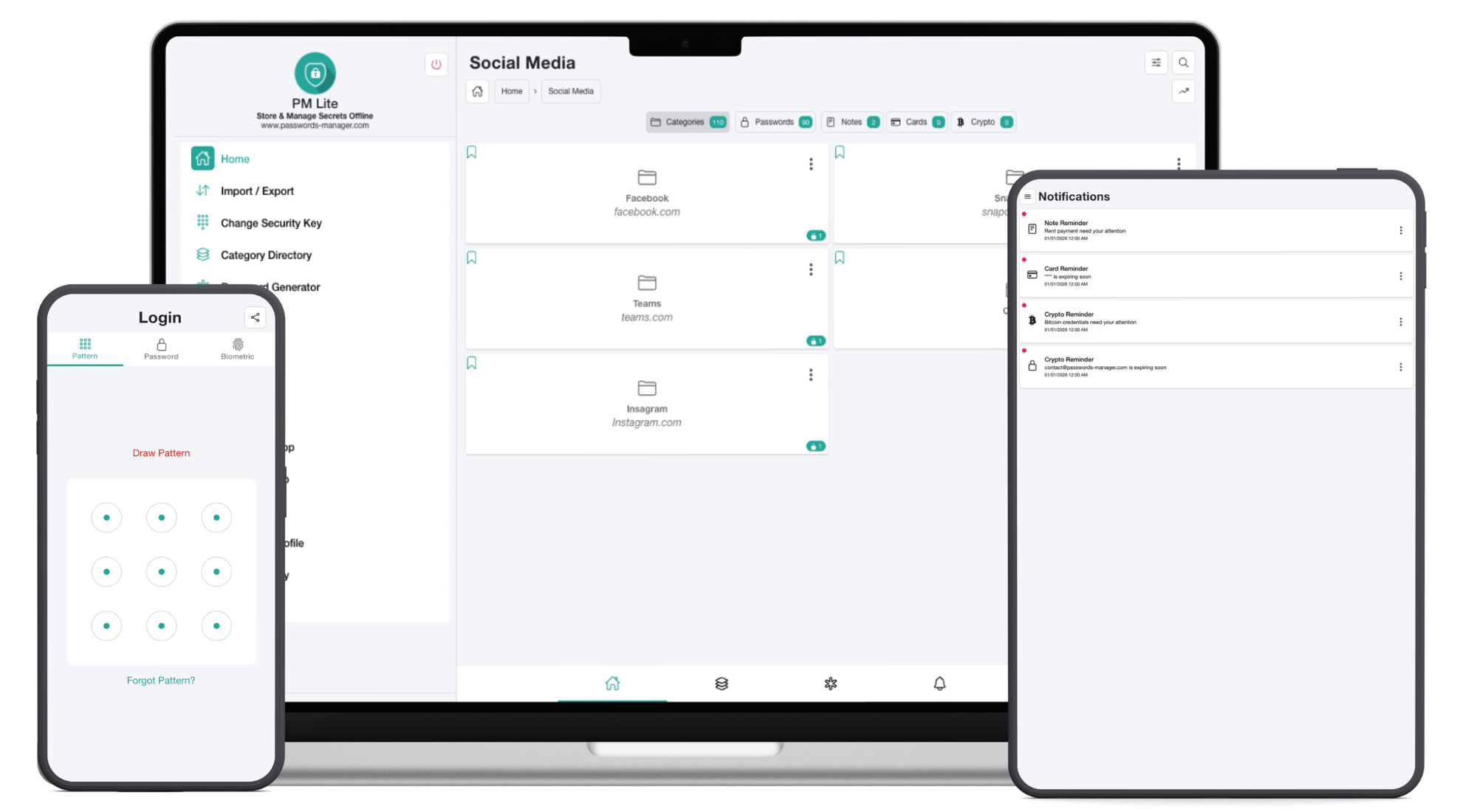 Passwords Manager is built for personal use, for individuals who want one private place for passwords, notes, images, 2FA codes, card details, and crypto wallet information. Losing access to those secrets is a real personal risk, not just something that matters to companies.